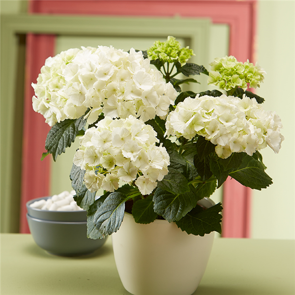 Hortensien (Hydrangea) machen sowohl im Garten als auch im Haus eine gute Figur. Wählen Sie zur Umsetzung des Trends „EASY“ Exemplare mit cremeweißen Blüten. Der botanische Name „Hydrangea“ ist ein Hinweis darauf, dass die Pflanze regelmäßig gegossen werden möchte. Warum wir diese Pflanze lieben? Wegen ihrer beeindruckenden Blütenbälle. Unzählige kleine Blütendolden ergeben in ihrer Summe die charakteristischen großen, runden Blüten. Stellen Sie die Hortensie an einen hellen Platz, vermeiden Sie jedoch die grelle Sonne.